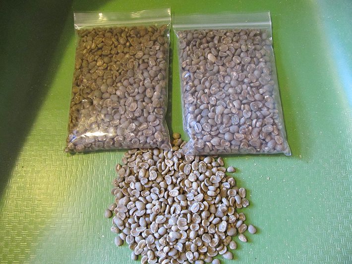 画像の袋に入っているのが、サンプル2種で、下は現在使用中のマンデリンの生豆です。