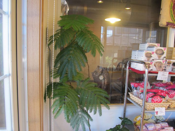 フォレストの店内、焙煎機の見えるところに涼しげなな葉を付けた木があります。
