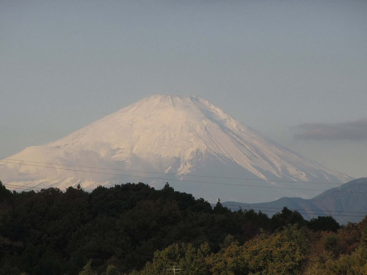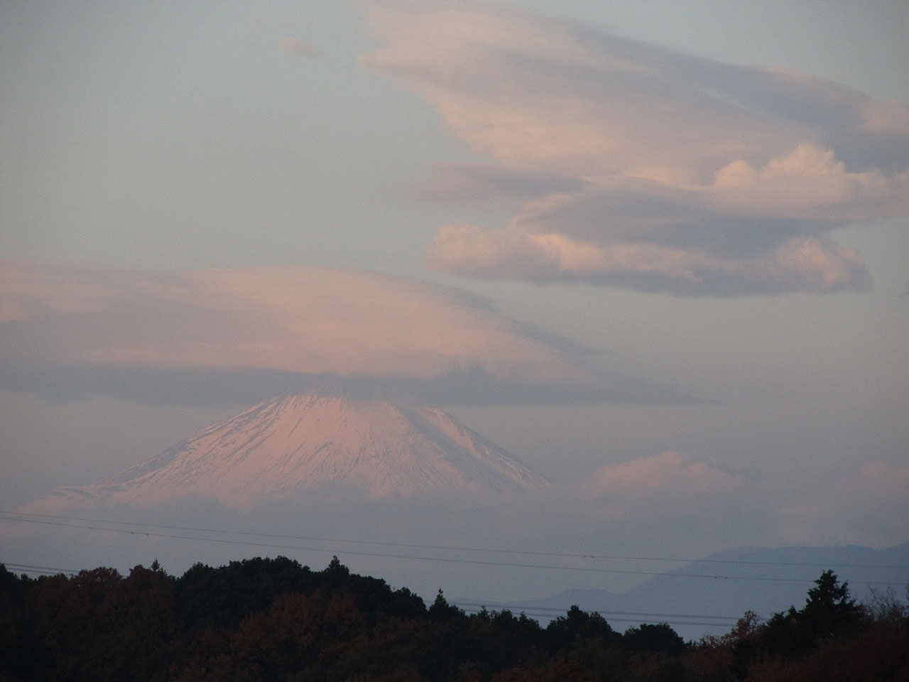 丘の木々もだいぶ色づいて来ました。 全部もみじの木だったら壮観でしょうが、そこは自然の里山、地味ながらもそれなりに風情があります。 富士山の山頂部分に雲が張り付いています。 見ようによっては傘雲に見えますが、どうなんでし…