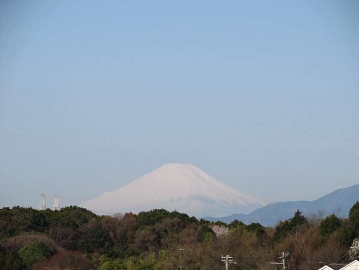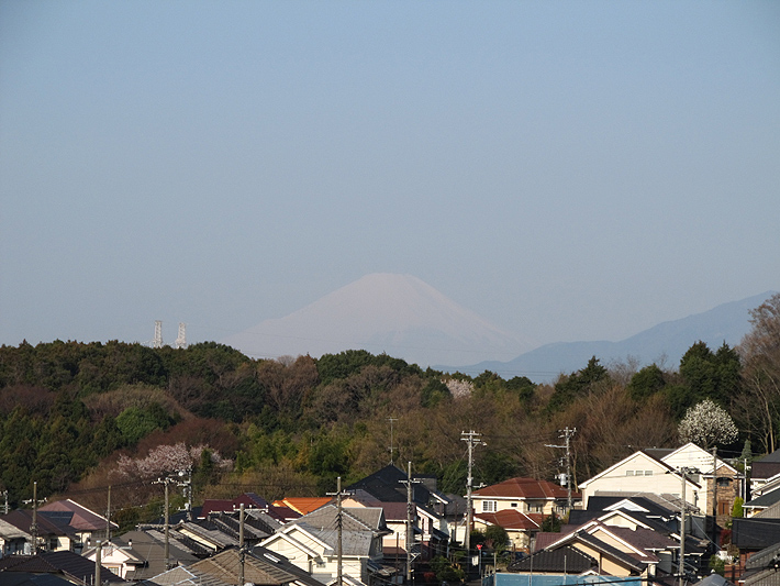 連休明け、お天気は良くなりましたが風が冷たい一日でした。 そんな気温でも桜がチラホラ咲いて来ました。 富士山手前の山にもうすピンク色の花を付けた樹が見えます。 何の花だか気になります・・・ 富士山は白い頭が見えるだけでし…